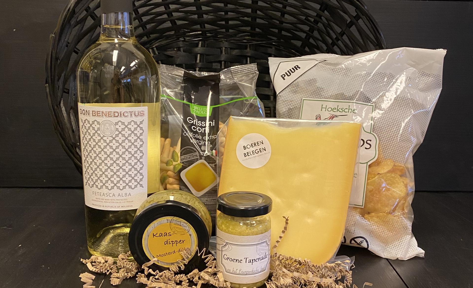 Deze mand is gevuld met lekkers voor de liefhebber voor iets hartigs. Heerlijk thuis genieten van een deze mooie wijn met een blokje boerenkaas met een kaasdipper en een borrelstokje met tapenade.